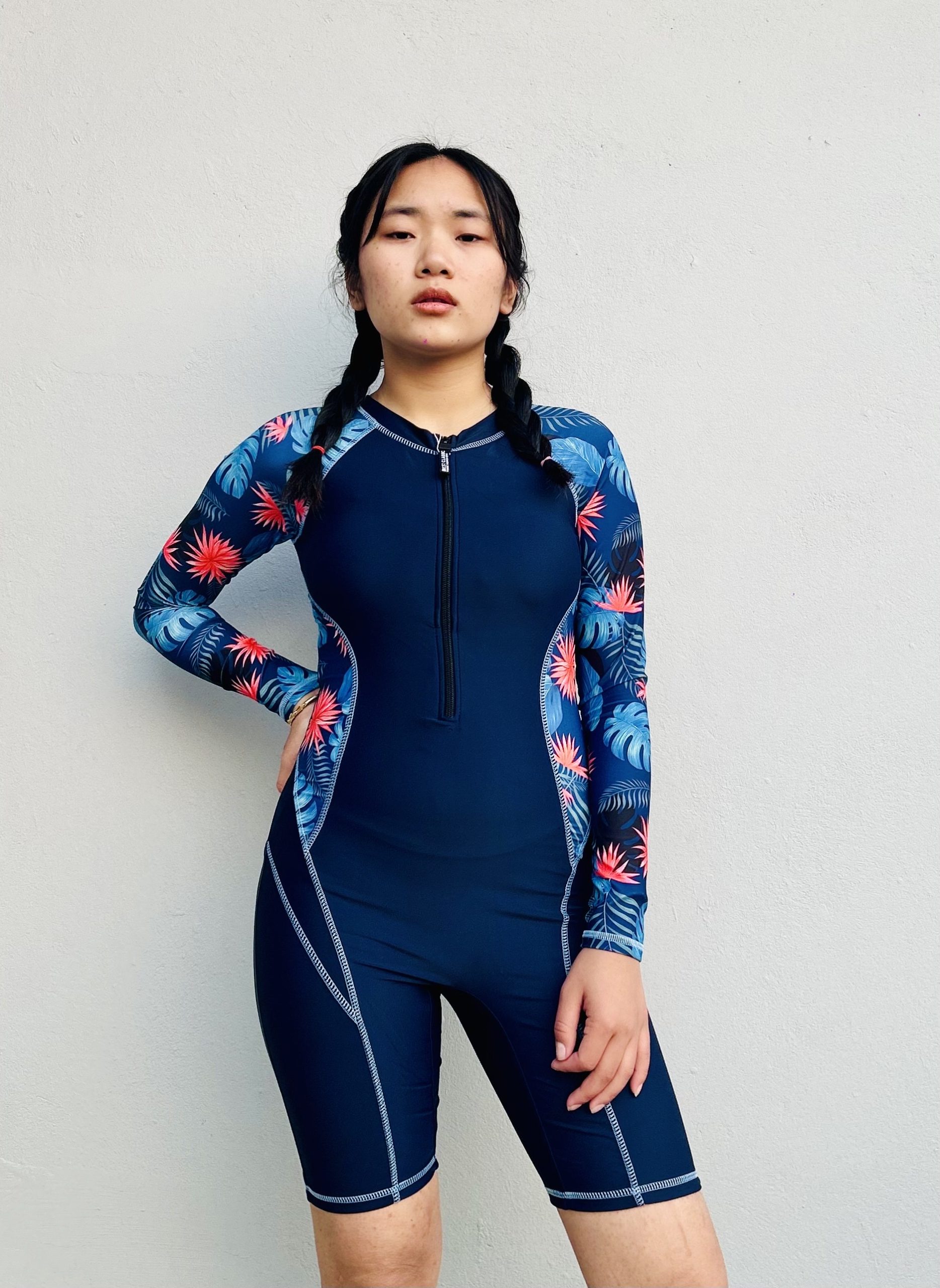 The Blue Floral Leaf Swim Suit offers a striking balance of bold design and practical swimwear technology. Its floral leaf patterned sleeves bring a tropical flair, while the snug yet stretchable fabric provides all-day comfort. Designed with long sleeves for sun protection and a front zip for easy wear, this swimsuit is perfect for competitive swimmers or beachgoers who value both looks and performance.